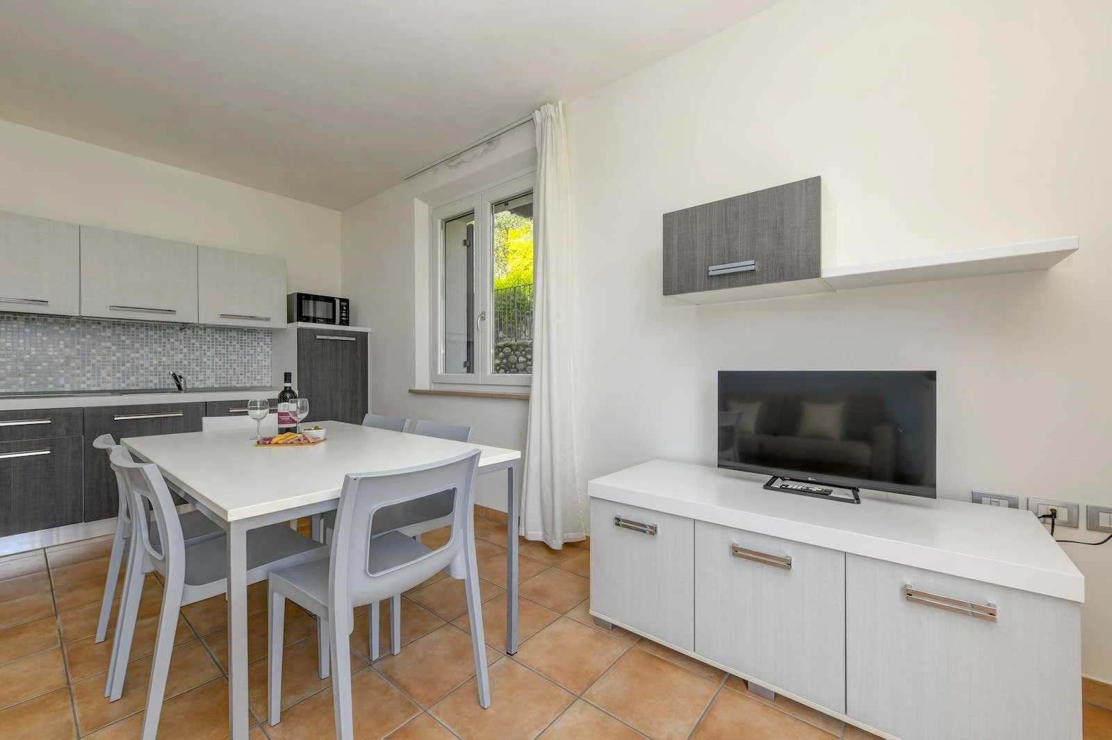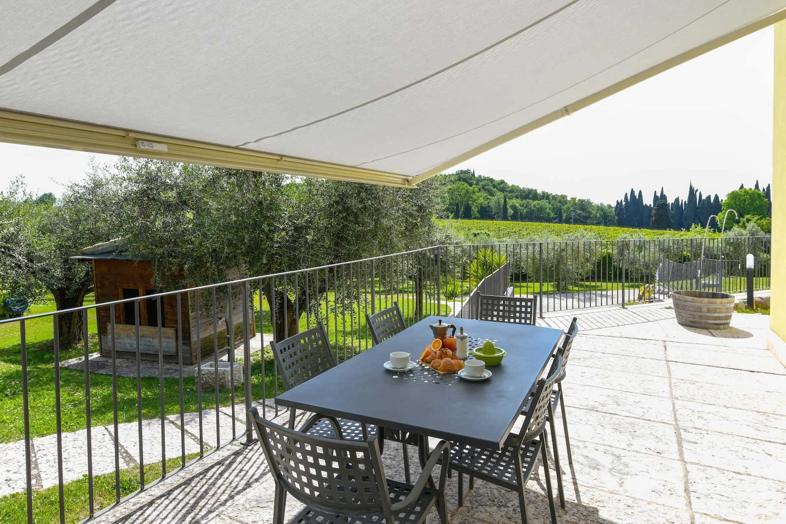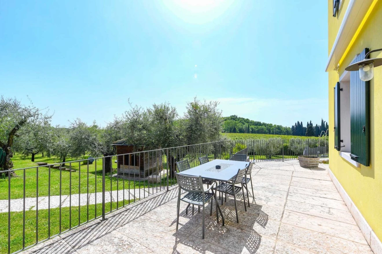 Outside, a large private area with sunshade lets you enjoy the outdoor space even during the warmest summer days, surrounded by the quiet atmosphere of Cavaion Veronese.