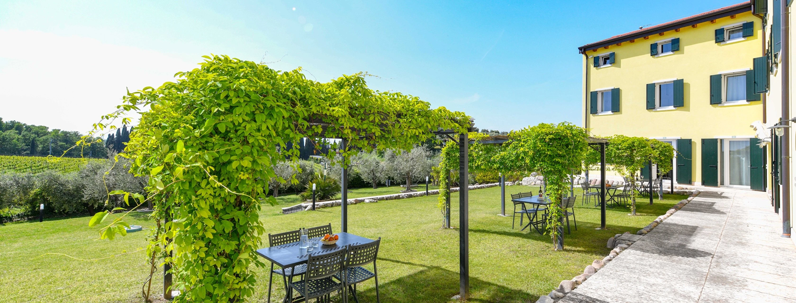 Outside, a private space with gazebo, table and seating allows you to relax outdoors while enjoying views of the vineyards of Cavaion Veronese.