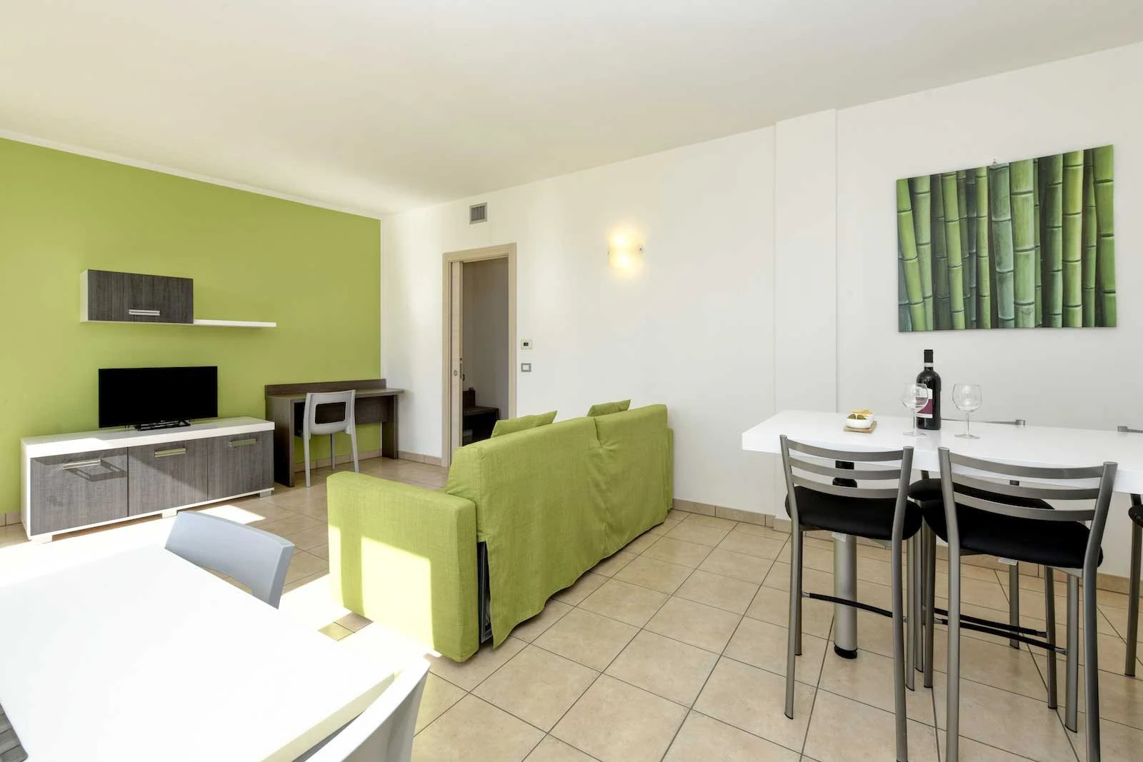 The apartment features a spacious bedroom with a double bed and a single bed, a bright living room with sofa bed and a fully equipped kitchen, offering comfort and independence throughout your stay.